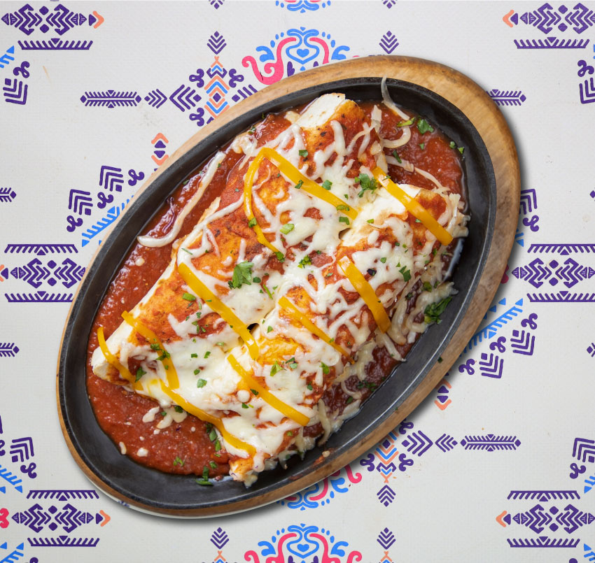 Our homemade grounded beef in red enchilada salsa, and wrapped in two tortillas, it comes in sizzling plate, topped with queso and cheddar. 9.50€