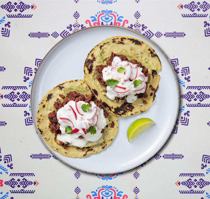 Two corn and spinach tortillas with Chorizo recipe, prepared with chickpeas, black beans, mushrooms, turnips, garlic, onions and Mexican spices. Toped with vegan mayo and radish. 7.00€