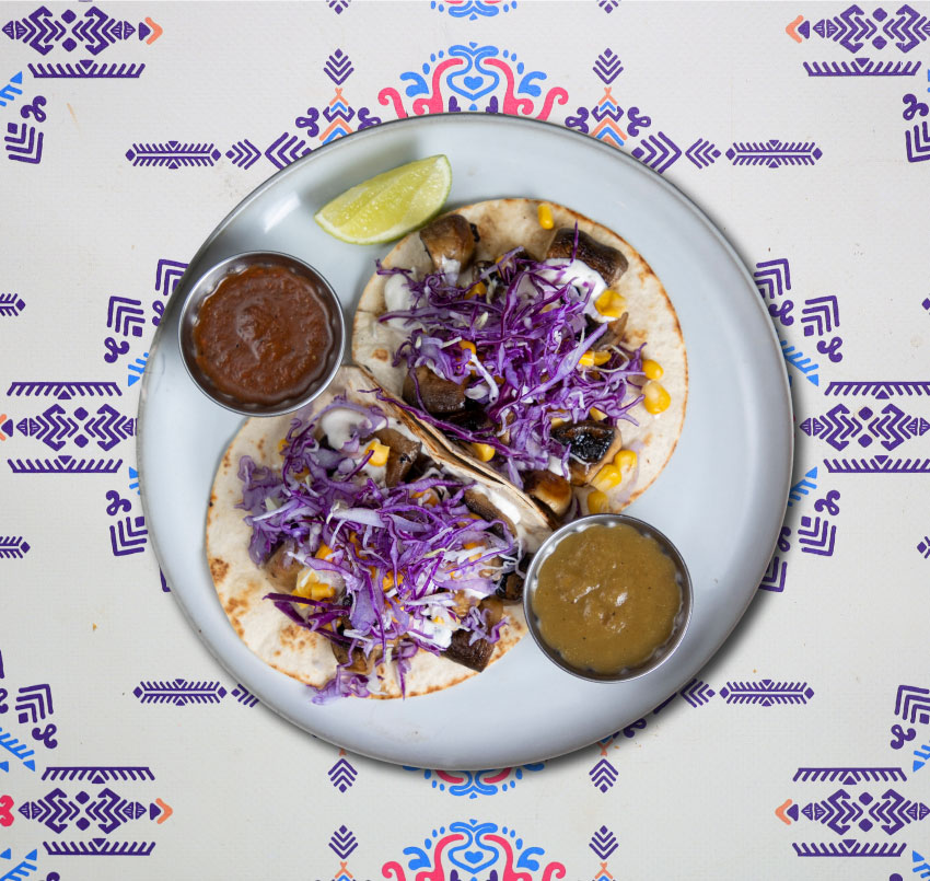 Two tacos prepared with fresh mushrooms, corn salsa and sour cream-cheese. Served with pico slaw, and our homemade salsa roja and verde.